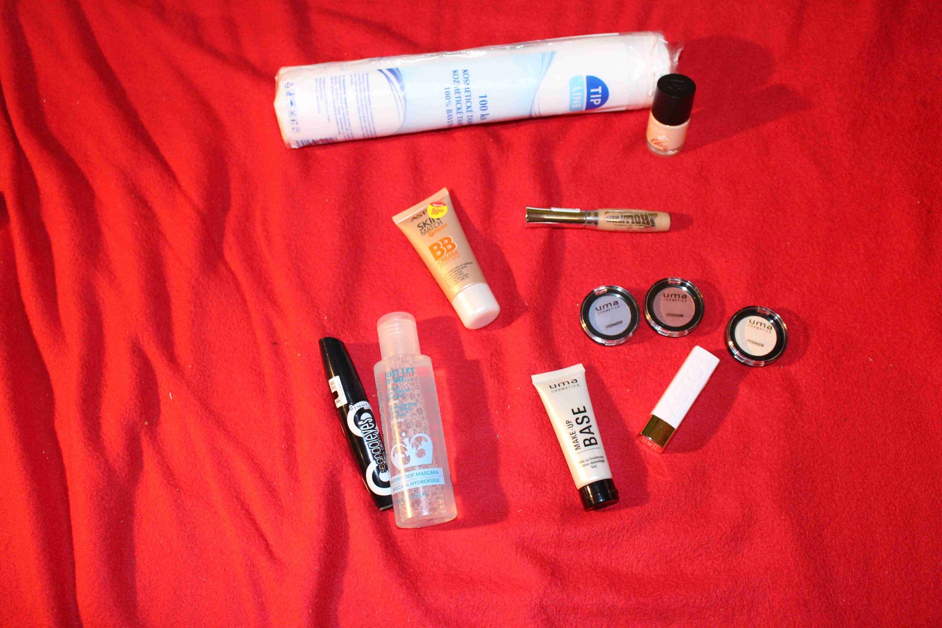 Tak na druhé fotce máme věci z TETA. Jak už jsem psala vše je ze slevového stojanu. Nahoře jsou klasické odličovací ubrousky za 29,90 Kč. Jsou ze 100 % bavlny a mám je již poněkolikáté. Vedle tampónků je lak v odstínu 126 Bare Yourself od Rimmel. Cena byla 19,90 Kč. Jedná se o lak z kolekce Kate Moss, Salon pro. Pod lakem je lesk od Miss Sporty, který jsem si vzala na test, když jsme zjistila kolik stojí. Cena byla za tento odstín 410 Melrose Avenue 9,90 Kč. Jedná se o lesk z kolekce Hollywood. Jsem na něj hodně zvědavá. Po levé straně je BB cream od Astor, který stál 99 Kč. Odstín je Nude a i když jsem hodně světlá, tak mi výborně sednul. Jsem zvědavá, jak bude v létě. Na pravo od BB creamu jsou tři stíny od UMA cosmetic. Jeden stín stál 24,90 Kč. Mám odstíny fialový číslo 28. queen of queen, červený stín 25 the beauty at least, neutrální stín 02 legaly long. Všechny stíny mají v sobě velice malý shimer, ketrý je skoro neznatený. Těším se až je vyzkouším. Pod stíny je rtěnka od Astor Soft Sensation Monisturizing lipstick odstín 201 Bright Pink. Krásná barva určitě jí brzy najdete ve rtěnkách v recenzi. Úplně menn uchvátila na jaro jedná se o růžový odstín. Miluji tyto rtěnky jak jsou krémové a vláčné na rtech. Rtěnka stála 49 Kč. Vedle rtěnky je báze pod makeup od UMA. To je pro mne velká neznámá a jsem na ní zvědavá. Báze stále 67 Kč. Poslední je duo řasenka odličovač od Rimmel. Řasenka je scandaleys retro. A pozor odličovač a řasenka stáli 49 Kč. Nevěřila jsem svým očím a byla jsem se dvakrát zeptat na cenu. Řasenka má úžasný kartáček a nadchla mne cena.