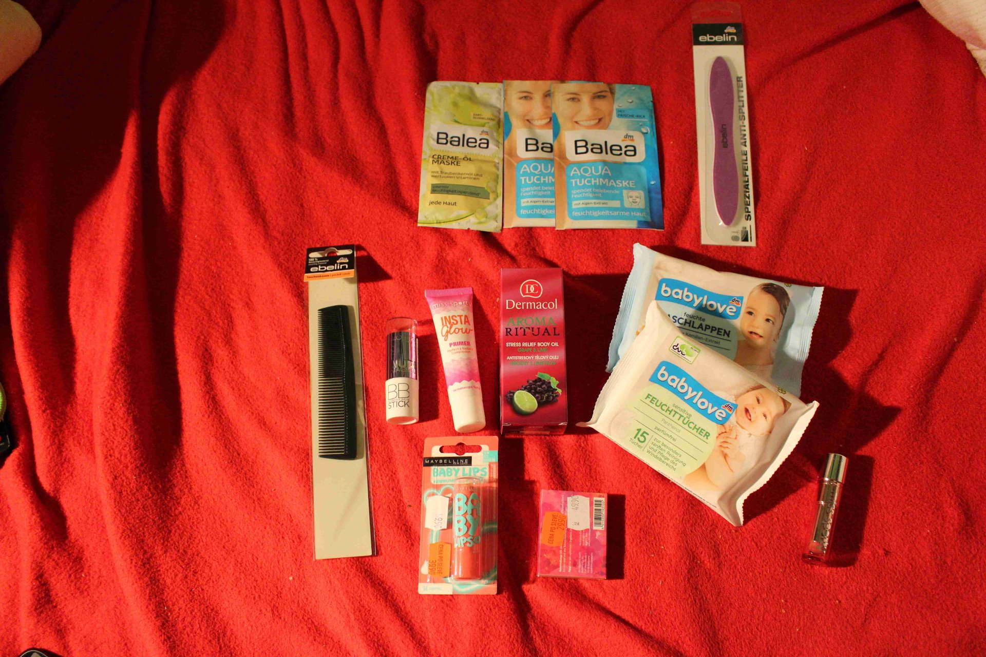 Na první fotce je můj úlovek z DM. Koupila jsem si malý hřeben do kabelky na ofinu za 39,90 Kč. Pak jsem si koupila dvoje vlhčené ubrousky na ruce, když někde jsem. Tyto ubrousky mám moc ráda, nelepí po nich ruce, nejsou parfémované a jsou vlhčené. tak akorát. Příznivá je i cena 14,90 Kč za kus. Další věc, která se na fotce leskne je z valentýnské edice Baby Lips a pozor, měla jsem super štětsí a našla jsem ho za 39,90 Kč, tak to mne potěšilo dvakrát. Malá krabička vedle Baby Lips jsou opět z valentýnské edice Ebelin malé pilníčky na nehty v krabičce. Super věc do kabelky. Cena po slevě byla 29,90 Kč. Vedle ubrousků je rtěnka od Miss Sporty, která mne šíleně nadchla, jak barvou tak vůní. Cena této super rtěnky je 67,90 Kč. Tato rtěnka byla ve slevě. Teď se přesuneme na věci mezi hřebenem a ubrousky. První po pravé straně od hřebenu je BB stick od L´oreal. Jsem na něj hrozně zvědavá, stál polovinu a byl v kuponové knížce. Cena byla 167,90 Kč. Vedle BB sticku je Primer od Miss Sporty. Chtěla jsem ho otestovat delší dobu. Cena 67 Kč. A hned u ubrousků leží můj veliký miláček Aroma rituals antistresový tělový olej s vůní horzny a limetka. Já tuto vůni miluji, tak mne hrozně nadchlo, že je v kuponové knížce. Cena byla před slevou 149,90 Kč. Ještě v sekci Demacolu se objevily mini tuhé parfémy, kde naleznete i tuto vůni. V první řadě z leva leží masky první maska je maska s olejem z hroznových jader. U této masky jsou dvě dávky. Další dvě masky jsou hydratační masky, kterým říkám provedení "bubák". Jedná se o masky, které jsou napuštěné do masky z netkané textilie, která se vyndá celá z obalu a přiloží se přímo na obličej a nechá se do kůže vsakovat z masky účinné látky. Cena jedné masky je 19 Kč. Jsem nesmírně na ně zvědavá, hlavně na masku bubáka. Určitě na ně naleznete recenzi. Poslední věcí na fotce je pilník proti štěpení nehtů, mám ho poprvé tak jsem dost na něj zvědavá. Cena 39,90 Kč.