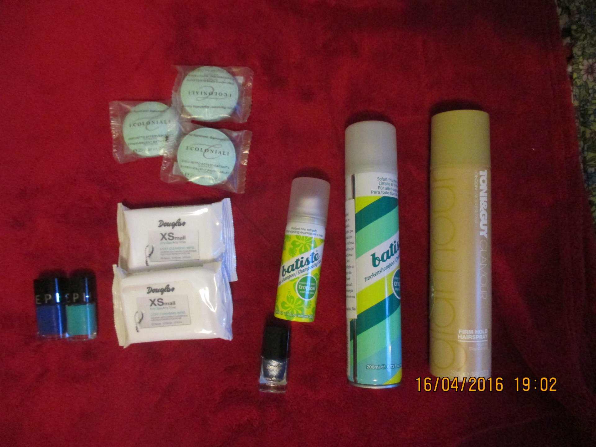 Douglas jsem navštívila už s jasně vybranými výrobky. Šla jsme si pro odličovací ubrousky, ale oni neměli veliké balení a tak jsme se musela smířit jen s malým balením do kabelky. Dále se v košíku objevil lak na vlasy Tony Guy, suchý šampon malá a velké balení, dvě balení odličovacích ubrousků tablety do koupele a jako dárek lak na nehty. ( na fotce jsou dva laky ze Shepory nějak jsem to popletla mezi sebe)