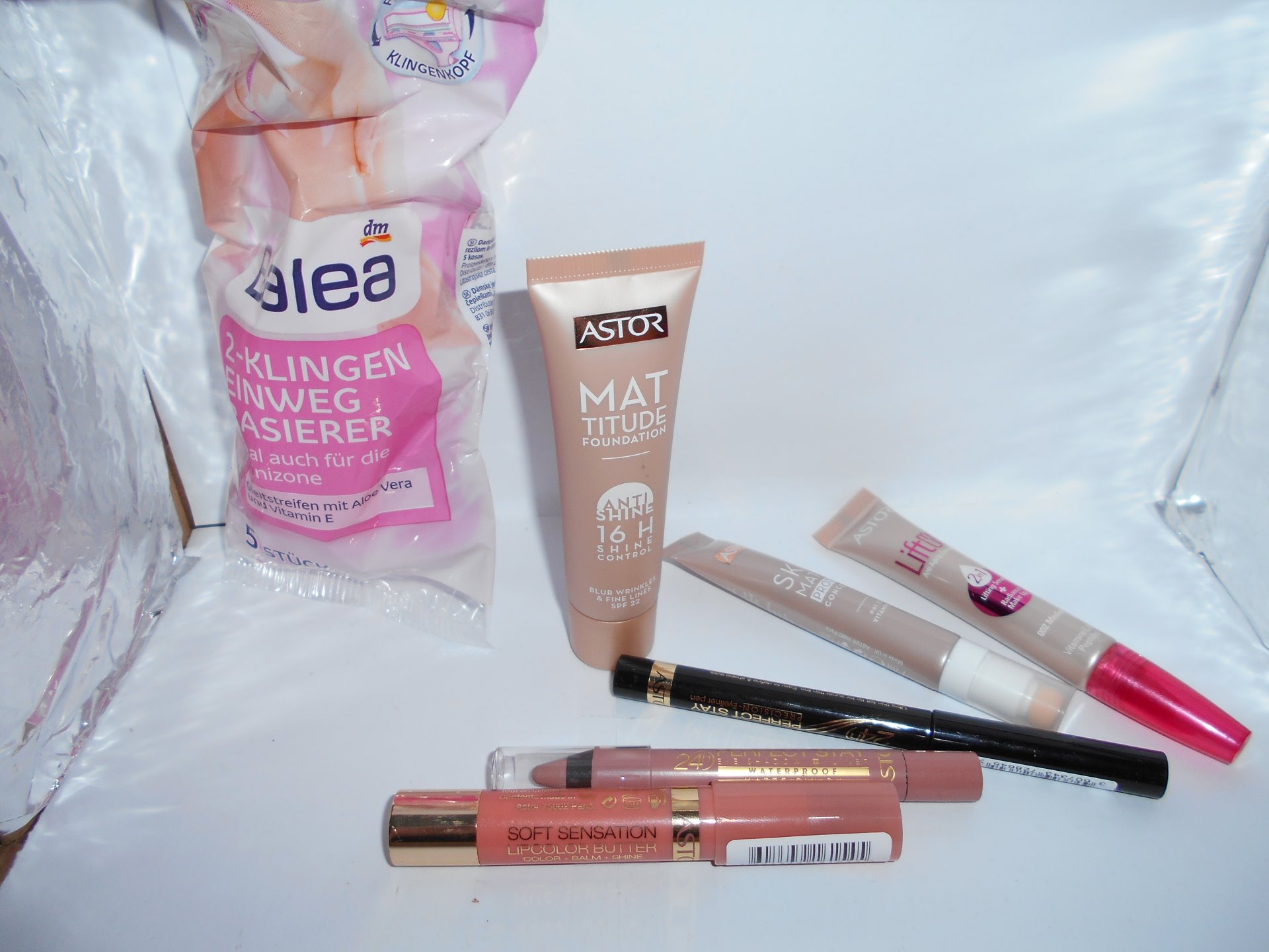 V Dm tam už to bylo trochu horší. Zjistila jsme že v Dm je výprodej Astor vše o 50% zlveněno no a neodolala jsem. Koupila jsme is stíny v tužce Perfect stay 24h, korektor Lift me up, Mat Titude foundatioh,linky na oči perfect stay,lipcolor butter a korektor skin match protetect. A ještě jsem si koupila jednorázová holítka na léto na cesty.