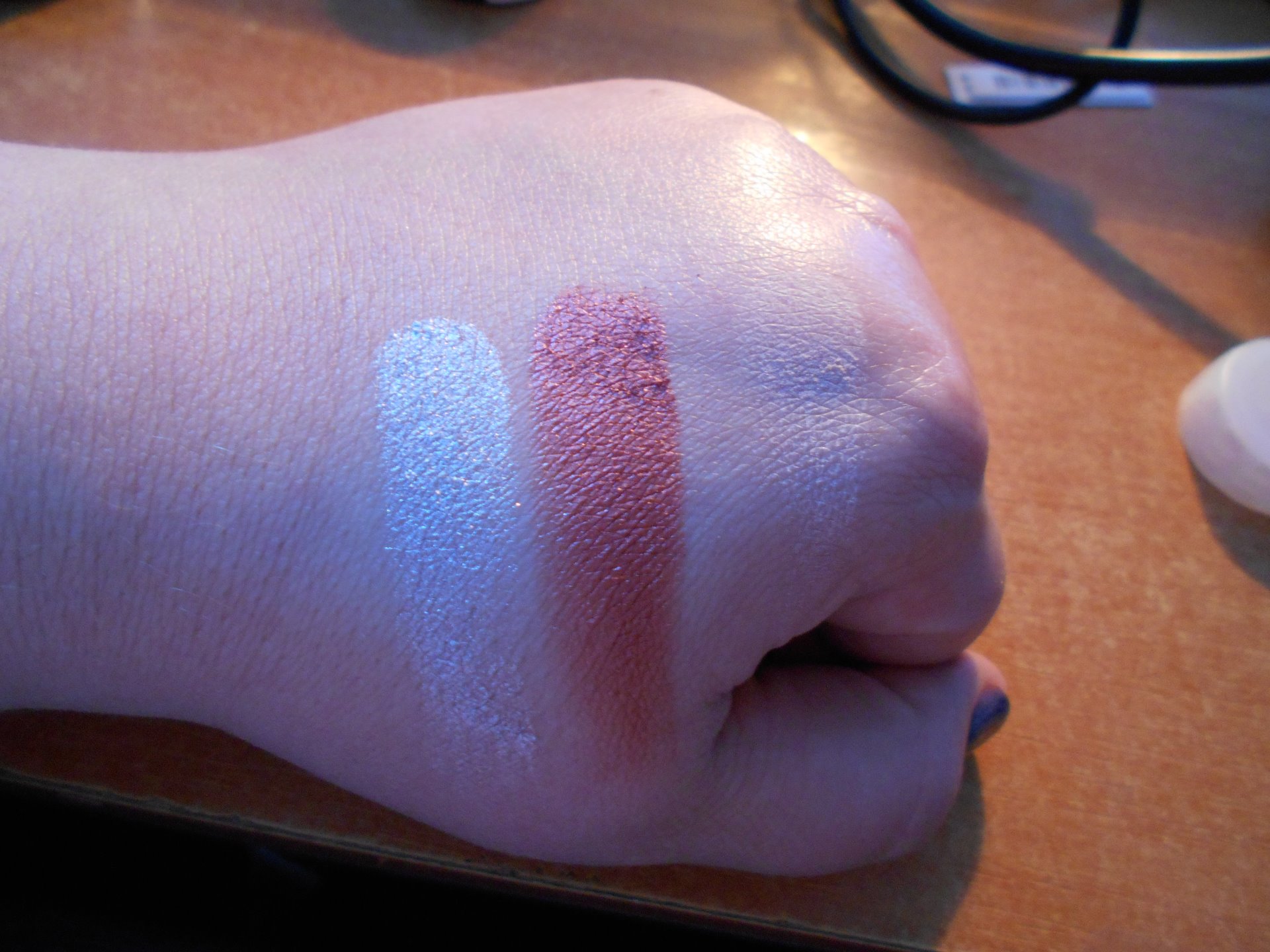 Pak tu máme dva krásné hnědé stíny. Začneme světlejším stínem. Světlejší stín je na očním víčku skoro neviditelný a jendá se o nude ostín. Stín je bez třpytek tím se dá krásně nanést na víčko, jako podkladový. Stíny jsou bezvadně pigmentované a stačí opravdu velice málo nanést na víčko. Světle hnědý stín je trochu prášivější, ale to je většina matných stínů. Světle hnědý i tmavě hnědý stín se dá použít za sucha nebo za mokra. Pokud použijete za mokra stíny se stanou úžasně pigmentované. Aplikace za mokra neznamená namočení stínů v paletce, ale namočíme si aplikátor, kterým aplikujem stíny. Tím stíny získají krémovou konzistenci jedinou nevýhodou krémové konzistence je poměrně horší nanášení na víčko. Tmavě hnědý stín je plný velkých zlatých třpytek. Tento stín je krásný na nasení podél řas, jako linka. Stín je hnědo fialový. Jediné, co je na tom to stínu horší, je že velké třpytky opadávají. Stíny vydrží na víčku po celý den i když člověk se potí nebo má mastnou pleť na, které nevydrží skoro žádné líčení.